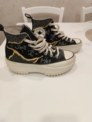 Zapatillas altas Converse con un diseño floral y detalles dorados. - Estampado floral sobre fondo negro. - Detalles en dorado. - Suela gruesa.