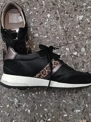 Zapatillas Geox con un diseño moderno y detalles llamativos. - Combinación de materiales en negro y estampado animal. - Cierre con cordones. - Suela blanca y negra. Dos puestaa