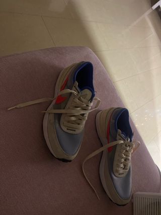 Bambas bajas. Con doble suela. Suela alta. Estampado rayado. Lineas. Color: blanco y azul con detalles marrones. Marca: Stradivarius. Estado: buen estado. Numero: 37 Mujer. Precio negociable. Hago envio