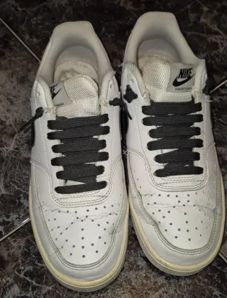 Zapatillas deportivas Nike Court Vision de color blanco. - Cierre con cordones negros. - Detalle de perforaciones en la puntera. - Logo de Nike en el lateral y la lengüeta. SIN PLANTILLAS Tiene un desperfecto en la parte alta del tobillo de la bamba derecha como se observa en la fotografía.