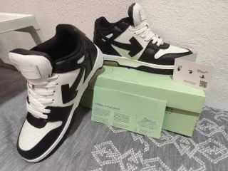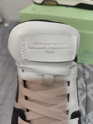 Zapatillas Off-White de diseño moderno. - Combinación de colores blanco y negro. - Detalle de flecha icónica en el lateral.
