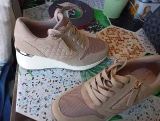 Zapatillas deportivas Mustang en color blanco con detalles dorados. Talla 39, tienen pequeña plataforma , puestas una vez son muy cómodas - Diseño moderno y cómodo. - Cierre con cordones. - Detalle de la marca en la lengüeta.