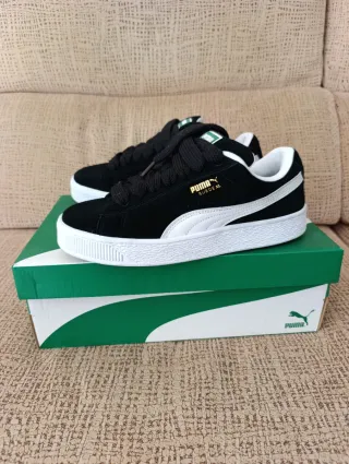 Zapatillas Puma Suede XL en color negro con detalles blancos. Incluyen cordones blancos adicionales. Talla 40.5 Unas horas de uso, impecables - Material exterior de ante. - Suela de goma. - Cierre de cordones.
