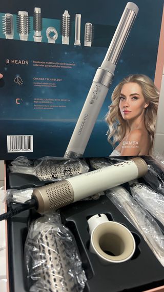 Moldeador multifunción Cecotec Bamba con 8 cabezales intercambiables para crear múltiples estilos de peinado. Incorpora tecnología Coanda para enrollar el cabello con aire y conseguir rizos perfectos. Su revestimiento es de cerámica con queratina y aceite de almendras. - 8 cabezales para diferentes estilos. - Tecnología Coanda. - Revestimiento Cerámica con Queratina y Aceite de Almendras. Nunca la he usado.