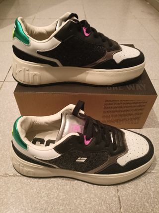 Vendo bambas D.Franklin Court Flag Glitter completamente nuevas y originales. Talla del pie 40 (25,5cm). Colores blancos y negros brillantes, con detalles rosas y verdes. Son preciosas con plataforma alta. Las compré por internet pero no acerté con la talla y ya no puedo devolverlas. Se incluye la caja.