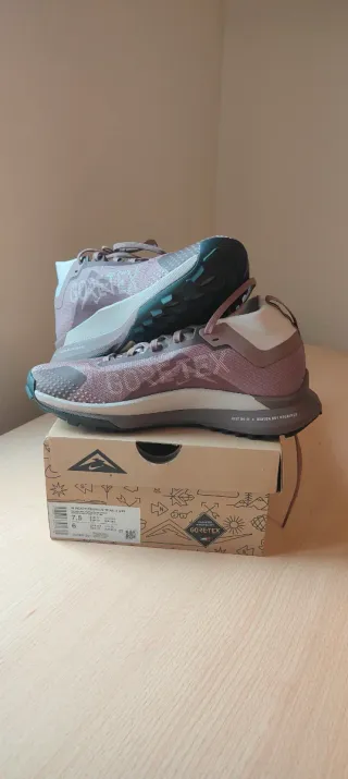 Zapatillas de trail running Nike con tecnología Gore-Tex. - Diseño en tonos grises y rosados. - Suela con buen agarre para terrenos difíciles. - Cierre de cordones. Totalmente nuevas, a mí hermana le van pequeñas y están por estrenar