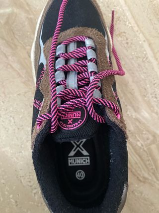 Zapatillas Munich de mujer, usadas solo una mañana. Se encuentran en excelente estado. - Diseño moderno con detalles en azul claro y rosa. - Cordones rosas. - Suela blanca y gruesa.