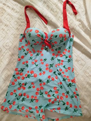 Bañador de una pieza estilo vintage. Talla 46. Bonito estampado. Lo he comprado porque me encanta la forma y el estampado. Me queda grande.
