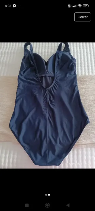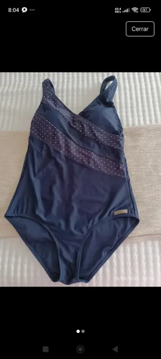 Bañador talla L, copa 90, de hombreras, relleno en el pecho y ajuste con lazo a la espalda. Sienta muy bien, ningún desperfecto ni falta, vendo por cambio de talla. Solo para enviar.