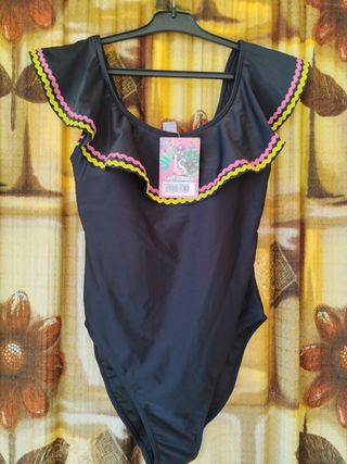 En color negro de lycra muy elástico Con volante en escote y hombros con ribete en rosa y amarillo Copas almohadillas Medidas en fotos