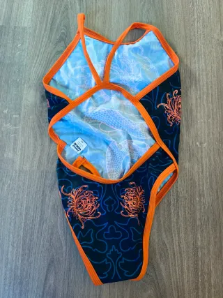 Bañador con un llamativo diseño de dragón. Empresa española, bañador de larga duración. - Estampado de dragón en naranja y azul. - Ribetes de color naranja. - Tirantes finos.