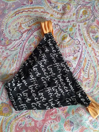Bañador tipo trikini asimétrico. Marca Fórmula Joven, de El Corte Ingles. En color negro, de tela tipo nido de abeja. Un solo tirante, y abertura en la cintura, es igual por delante que por detrás. Es talla 44 pero da menos talla, es equivalente a una 42. No se ha llegado a estrenar.