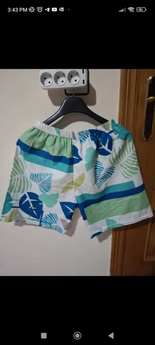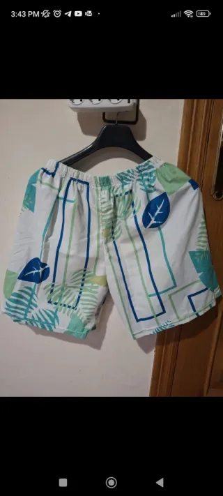 Shorts playeros con un diseño tropical vibrante. Perfectos para cualquier uso. - Estampado de hojas y rayas. - Cintura elástica para mayor comodidad. - Como nuevo sin detalles