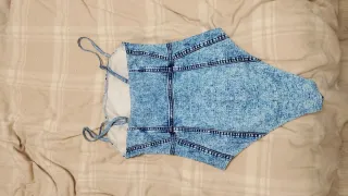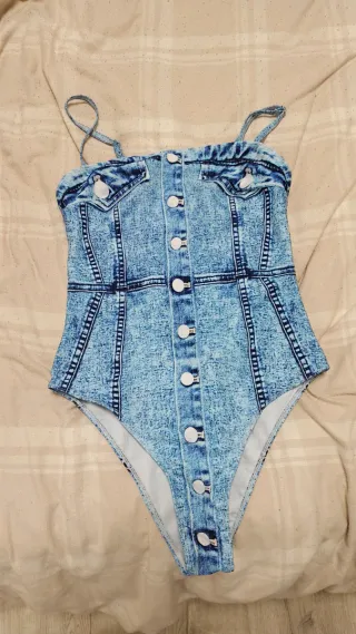 Este bañador tiene un diseño inspirado en la tela tejana, con un frontal de botones. Con forro y braga ancha - Diseño estampado de tejano. - Cierre de botones en la parte delantera. - Tirantes finos ajustables.
