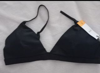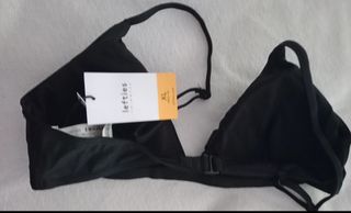 Preciosa parte de arriba de bikini de la marca Lefties. Es de color negro y talla XL (equivalente a 42 o 14). Está en perfecto estado. - Tirantes finos ajustables - Cierre de clip en la espalda - Tejido suave y ligero