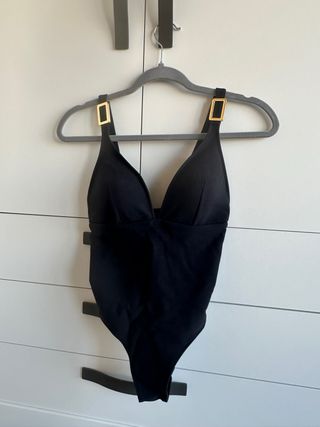 Bañador de mujer en color negro. Diseño elegante con detalles dorados en los tirantes. Tejido de gran calidad. - Tirantes ajustables con detalle metálico dorado. - Escote pronunciado en pico. - Corte favorecedor.
