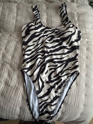 Bañador con un llamativo estampado de cebra y un diseño favorecedor. - Escote pronunciado en la espalda. - Diseño de cebra en blanco y negro. - Probado una vez y lavado.