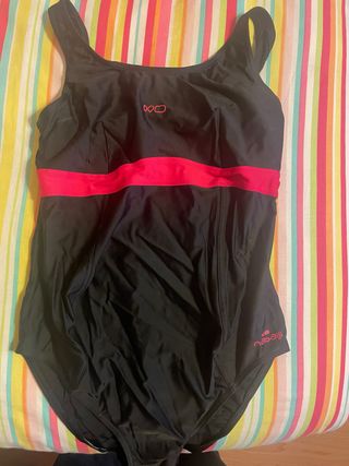 Bañador de maternidad de la marca Nabaiji, diseñado para ofrecer comodidad durante el embarazo. Usado dos veces. - Color negro con detalles en rosa. - Banda elástica en la cintura para un mejor ajuste. - Tirantes anchos para mayor soporte.