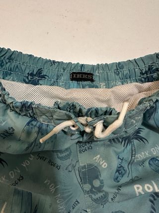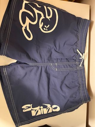Bañador de la marca El Niño en color azul.Talla 16 años - Diseño con estampado gráfico. - Cintura elástica con cordón. - Costuras blancas decorativas.