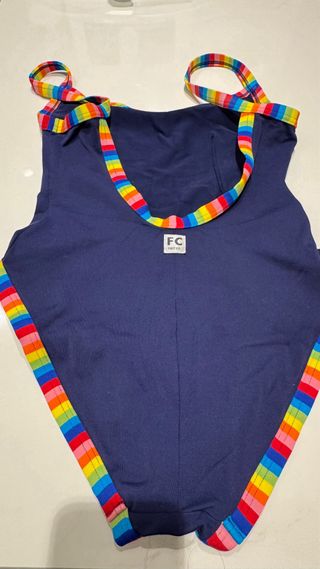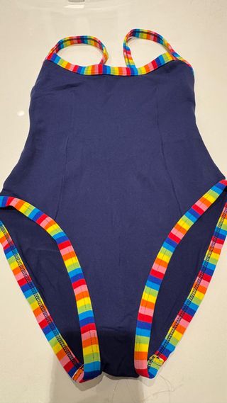 Bañador de una pieza con un diseño llamativo. - Ribete de tirantes y perneras con estampado de arcoíris. - Corte clásico y cómodo.