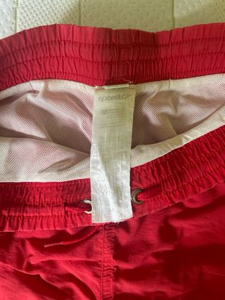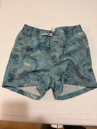 Bañador infantil con divertido estampado de tiburones. Se encuentra en perfecto estado. - Estampado de tiburones sobre fondo rojo. - Cintura elástica con cordón. - Detalle de forro interior azul.