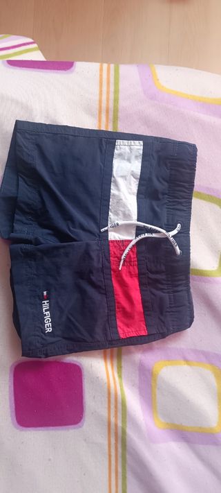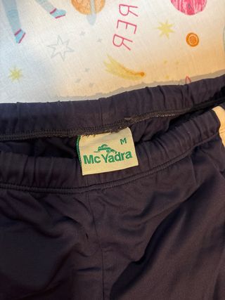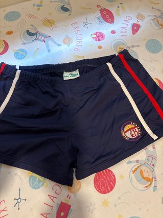 Bañador corto para niño de la marca McYadra, talla M. Es de color azul marino y tiene detalles en rojo y blanco. Está en buen estado. - Diseño deportivo. - Cómodo y ligero. - Ideal para piscina o playa.