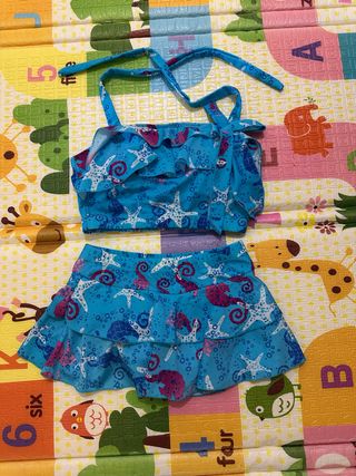 Conjunto de bañador de dos piezas para niña con un divertido estampado marino. - Parte superior tipo top con volantes y tirantes. - Braguita tipo falda con volantes. - Diseño con estrellas de mar y caballitos de mar.