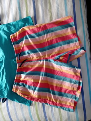 Pantalones de baño para niño, ideales para el verano. Son dos bañadores, uno rojo y otro turquesa. - Están en buen estado. - Perfectos para la piscina o la playa. - Cómodos y ligeros.