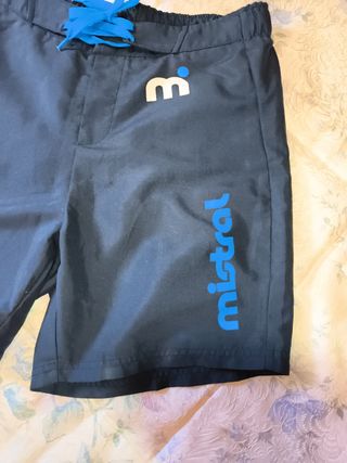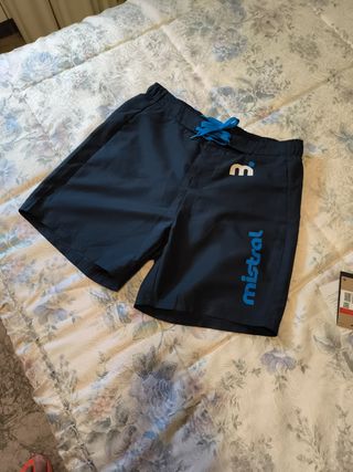 Bañador corto Mistral, talla S (34-36/44-46), color azul marino. En buen estado. - Diseño deportivo. - Cintura elástica con cordón. - Logo Mistral en azul.