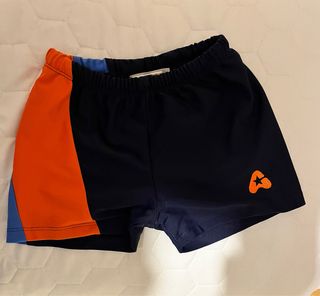 Bañador de natación para colegio con diseño deportivo. - Paneles laterales en color naranja y azul. - Logo de la marca en la pierna derecha.