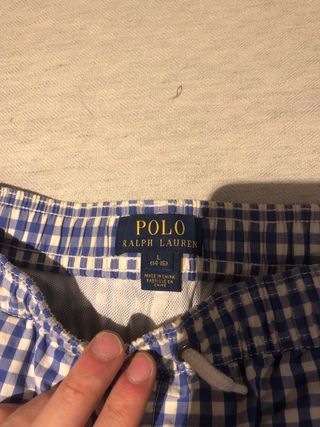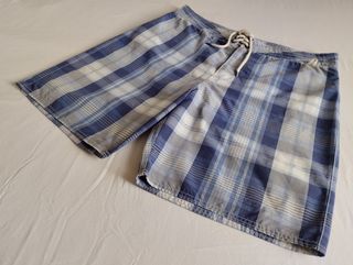Bañador tela algodón 10% marca Ralph Lauren con estampado azul a cuadros. Talla USA 34 que es igual a una talla 44 en España de esta marca. Por si acaso añado medidas aproximadas: - Ancho de cintura: 46 cms - Largo: 50 cms