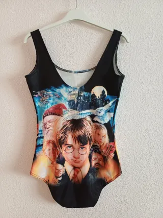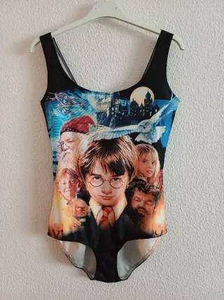 Bañador con estampado de la caratula de la primera película de Harry Potter. Está en perfecto estado. Nunca se ha usado. No tiene etiqueta. Es tela de bañador elástica. Medidas aproximadas: - De cadera a cadera: 40 cm - Cintura: 33 cm - De axila a axila: 38 cm - Altura total (desde hombros hasta abajo): 69 cm