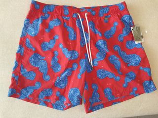Bañador caballero color rojo con adornos de caballitos de mar en azul. Marca Pedro del Hierro. Talla XL. Con 2 bolsillos laterales y 1 trasero. Nuevo y con etiqueta.