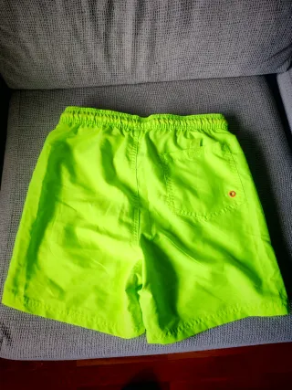 Bañador amarillo fluorescente con detalles en naranja fluor. Cinturilla elástica con cordón. Totalmente nuevo, sin estrenar. Tiene redecilla interior, dos bolsos laterales uno trasero con cierre de velcro y uno pequeño interior para llaves, monedas etc.... Medidas en las fotos