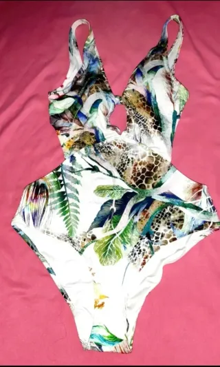 Bañador de una pieza estilo trikini, nuevo a estrenar. Destaca por su diseño moderno y favorecedor con grandes aberturas laterales (cut-out) que dejan la cintura al descubierto. Estampado: Diseño exótico y colorido que combina motivos tropicales (hojas de palma y flores) con toques de animal print (piel de serpiente y leopardo) en tonos azules, verdes, amarillos y rosas sobre fondo blanco. Corte delantero: Escote pronunciado en forma de "V" muy elegante. Corte trasero: La espalda queda parcialmente descubierta, con un cierre tipo broche metálico en la parte superior para mayor sujeción y comodidad. Detalles: Forro interior