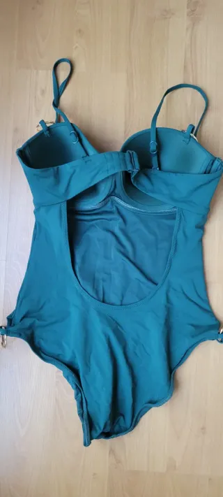 Bañador de una pieza en color verde azulado. Presenta un diseño favorecedor con copas y detalles de aros. - Copas con soporte. - Aros metálicos en los laterales. - Tirantes ajustables.
