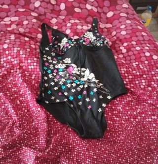 Precioso bañador de bikini de dos piezas con estampado floral. El diseño es favorecedor y elegante. Talla parte de arriba 85B, parte de abajo M. - Diseño de bikini de dos piezas. - Estampado floral multicolor sobre fondo negro. - Tejido suave y ligero.