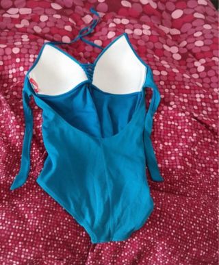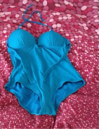 Bañador con escote de pico y tirantes anchos que se estrechan en la espalda. Copas preformadas sin aros con top interior para mayor sujeción del pecho. Espalda no muy escotada. Cinta en el mismo tejido que envuelve la cintura separando ópticamente el pecho del abdomen. Estampado de cachemir en tonos azules muy favorecedores. Forro color blanco. Talla S. Elastano y Poliamida. Costó 85€