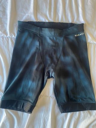 Bañador premamá de la marca Nabaiji. - Diseño en color negro y amarillo mostaza - Talla S. - Tirantes ajustables - Nuevo, sin usar - Incluye gorro de silicona y tapones nuevos - Sólo hago envíos
