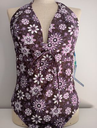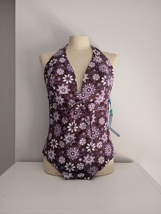 Precioso bañador de estética retro. Es un diseño favorecedor con estampado floral en tonos morados. El color real es el de las últimas fotos. - Escote halter. - Diseño entallado. - Copas con relleno y sin aros - Cordón ajustable debajo del pecho