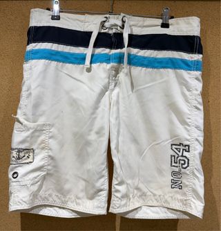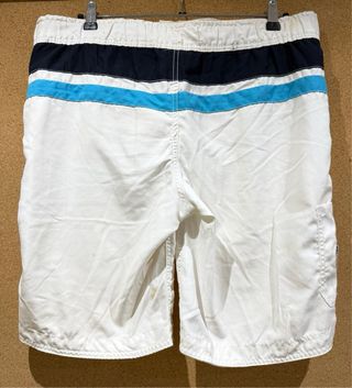 Bañador de hombre Springfield a rayas, en azul y beige. Es un bañador de corte clásico. Talla: L. Usado, pero en buenas condiciones. - Tiene bolsillos. - Cintura elástica con cordón. - Ideal para verano.