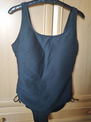 Bañador de una pieza de Aldi negro y gris. Diseño con fruncido en escote y en V. Espalda alta para mayor sujección. A estrenar.