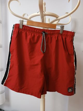 Bañador de hombre a rayas, ideal para el verano. Es de la marca Beach Company y luce en excelentes condiciones. - Diseño de rayas multicolor en tonos naranjas. - Cintura elástica con cordón. - Bolsillos laterales.
