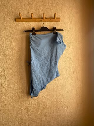Bañador azul asimétrico, con un tirante, detalle abertura, tiene esponjas en el pecho. Azul claro. Talla L