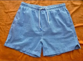 Bañador Spagnolo para hombre, talla M. Es de color azul marino con rayas blancas y azules. Está en buen estado, pero la entrepierna está cosida porque una vez se descosió (adjunto foto). - Diseño elegante y cómodo. - Ideal para verano. - Cintura elástica con cordón.
