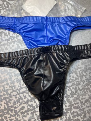 Conjunto de dos bañadores tipo tanga. - Un bañador es de color gris. - El otro bañador es de color rojo. - Ambos tienen cordones para ajustar.