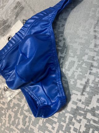 Este bañador tipo tanga es de un llamativo color azul. - Material brillante. - Cintura elástica.