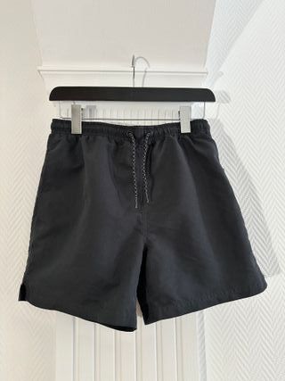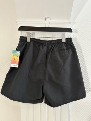 Shorts / bañador negro de Primark nuevo con etiqueta, sin usar. Talla S (30–32 pulgadas / 76–81 cm). Cintura elástica con cordón ajustable y bolsillo trasero. Muy cómodo para playa, piscina o verano. Tejido ligero de poliéster (mínimo 50% reciclado según etiqueta). Está completamente sin estrenar, con la etiqueta original puesta.