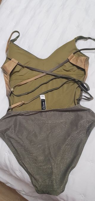 Conjunto de tres bañadores para mujer+ bolsa de gran capacidad para playa/ piscina - Quedan preciosos puestos,muy favorecedores y el de la gasa por delante y detrás tapa tripa😄. - Diseño con detalles dorados. - Tirantes ajustables. - Tejido ligero y fluido. - Apenas tienen uso por problemas de salud. Pueden hacer más lotes con otros productos a su gusto y ahorrar gastos de envío. Seran aproximadamente una L más menos y XL el de los vuelos. NO HAGO ENVÍOS POR ONTIME NO SON FIABLES NI SEGUROS. PREFIERO INPOST QR.