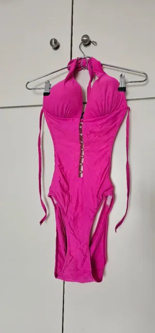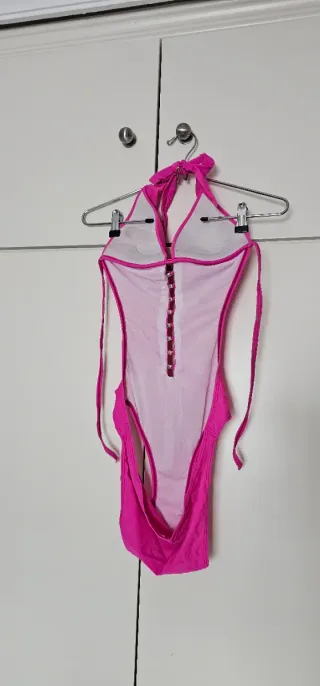 Triquini de color rosa vibrante, con un diseño moderno y atrevido. - Escote pronunciado con detalles de anillas metálicas. - Tirantes finos para atar al cuello. - Corte alto en las caderas. - Espalda descubierta.
